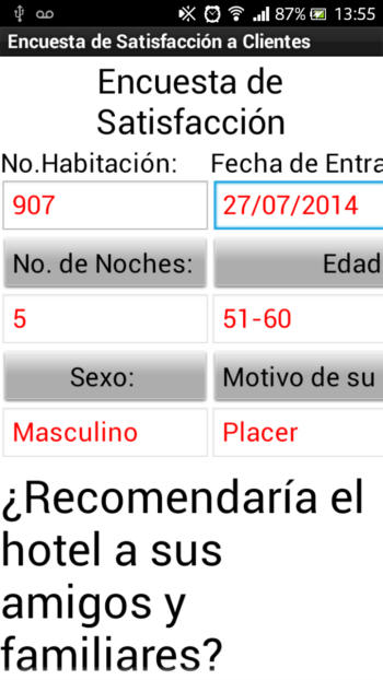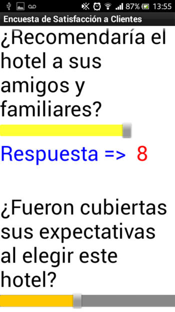 A continuación se muestra un ejemplo de encuestas de satisfacción de clientes para un hotel. El funcionamiento es similar para otro tipo de preguntas y otro sectores donde se desee hacer el estudio de mercado.